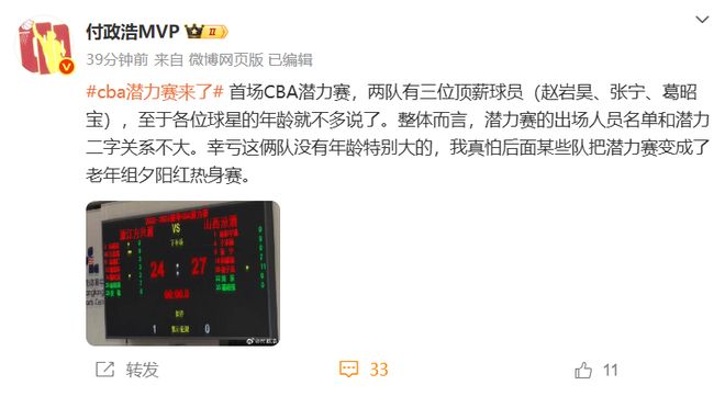 大量球迷在批评和嘲讽,就连一向站在CBA这边的媒体人也有点绷不住,媒体人付政浩赛后更是给出了这样的辣评:首场CBA潜力赛,两队有三位顶薪球员(赵岩昊、张宁、葛昭宝),至于各位球星的年龄就不多说了。整体而言,潜力赛的出场人员名单和潜力二字关系不大。幸亏这俩队没有年龄特别大的,我真怕后面某些队把潜力赛变成了老年组夕阳红热身赛。