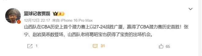 篮球记者贾磊,在赛后也暗讽了一番潜力赛:山西队在CBA历史上首个潜力赛上以27-24战胜广厦,赢得了CBA潜力赛历史首胜!张宁、赵岩昊悉数登场,山西队老将葛昭宝也获得了宝贵的出场机会。
