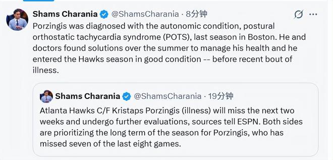 上赛季效力凯尔特人期间,波尔津吉斯被确诊患有自主神经功能障碍类疾病——体位性心动过速综合征(POTS)。休赛期,他与医疗团队共同制定了健康管理方案,得以以良好状态开启老鹰队的新赛季征程,直至近期突发疾病。