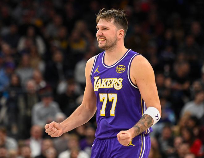 湖人客场挑战爵士,湖人少了里夫斯、艾顿、文森特,爵士少了马尔卡宁、凯斯勒,前三节比赛爵士占据上风,一度领先10分,三节战罢领先4分,第四节湖人单节赢了12分完成逆转,最终湖人以8分优势拿下比赛。东契奇28中14(三分12中4)得到45分11板14助5断,砍下超级三双,詹姆斯17中8得到28分7板10助,爵士方面乔治20中9(三分11中5)得到34分4板8助,科利尔12中6得到18分13助。